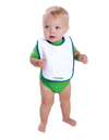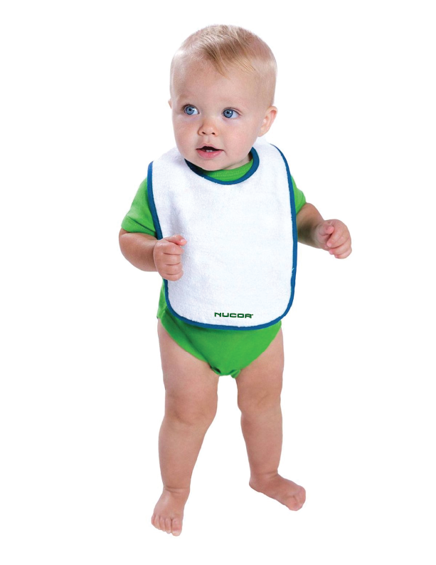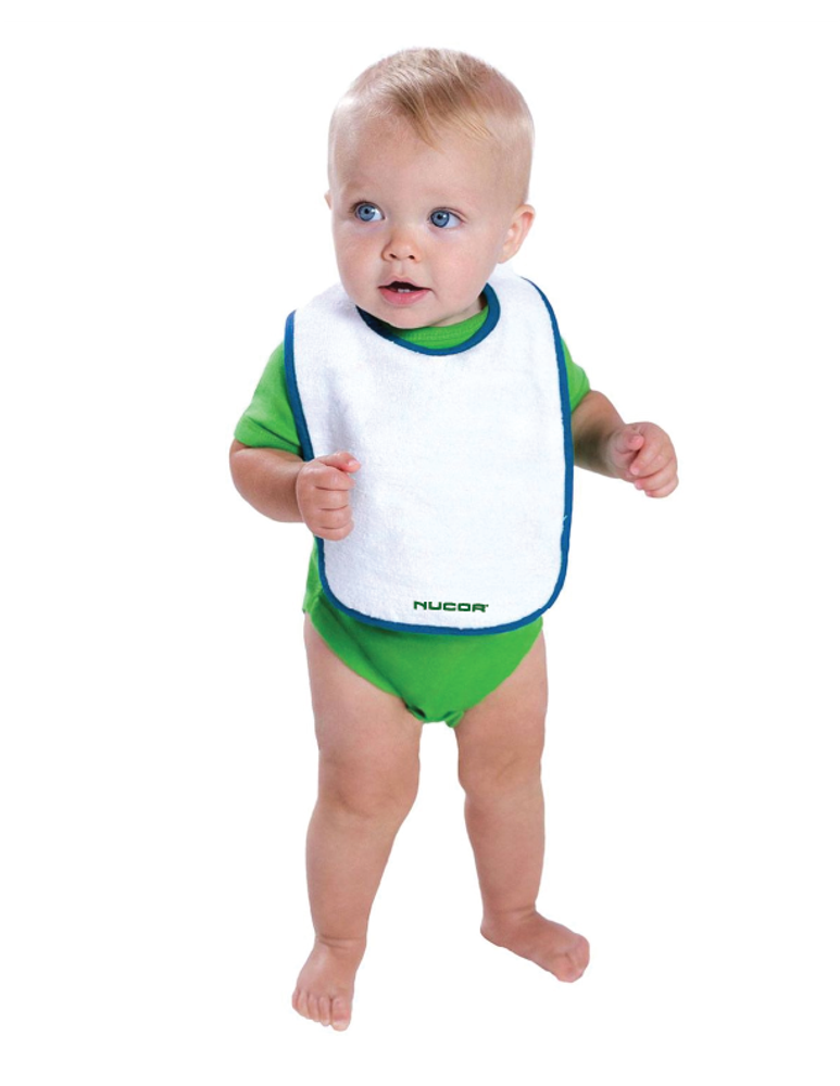 Perfect for mess-free meals. This bib is made of heavyweight absorbent terry cloth to help keep baby clean while eating. 100% cotton terry Contrast color binding Reinforced two-snap closure EasyTear label for additional comfort and ability to brand as your own.