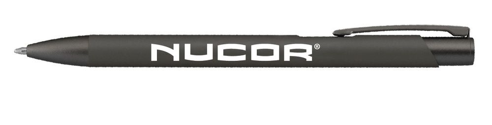 Nucor's Softy Monochrome Metallic Pen - a sophisticated pen designed to elevate your writing experience. With its aluminum barrel, satin rubber finish, and matte painted metallic tips, plunger, and clip that match the pen's overall design, this pen seamlessly blends style and functionality. Crafted for precision, this pen features a slim ballpoint design providing a smooth and consistent writing. The Nucor word logo is laser engraved.