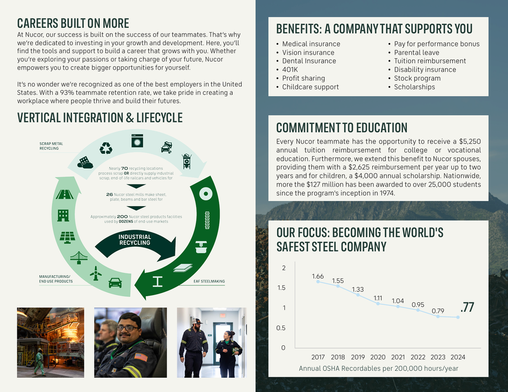 Working at Nucor isn't just a job, it's an opportunity to work for one of the best employers in the United States. Share all the reasons why with this recruiting brochure.