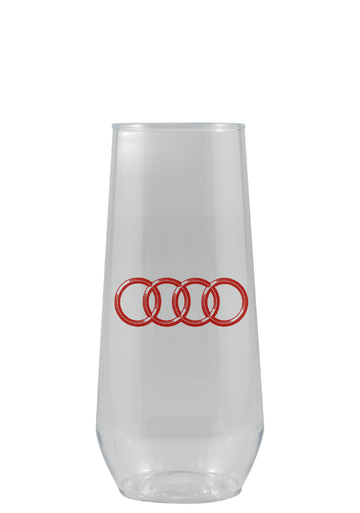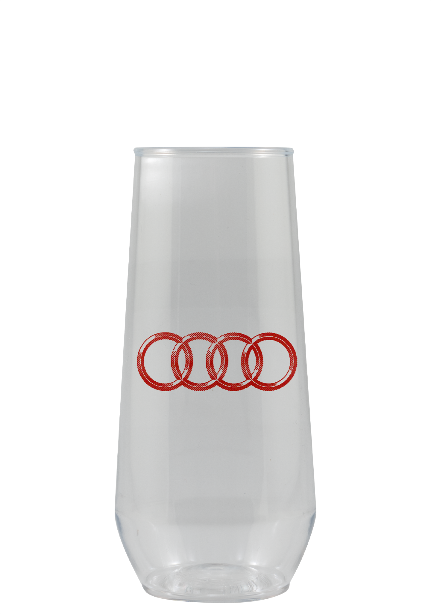 sku: T-RSFL10Our 10 oz. stemless flute will provide the perfect touch of elegance to any occasion where drinks are served! Made of clear flexible plastic. This product is made and printed in the USA.
