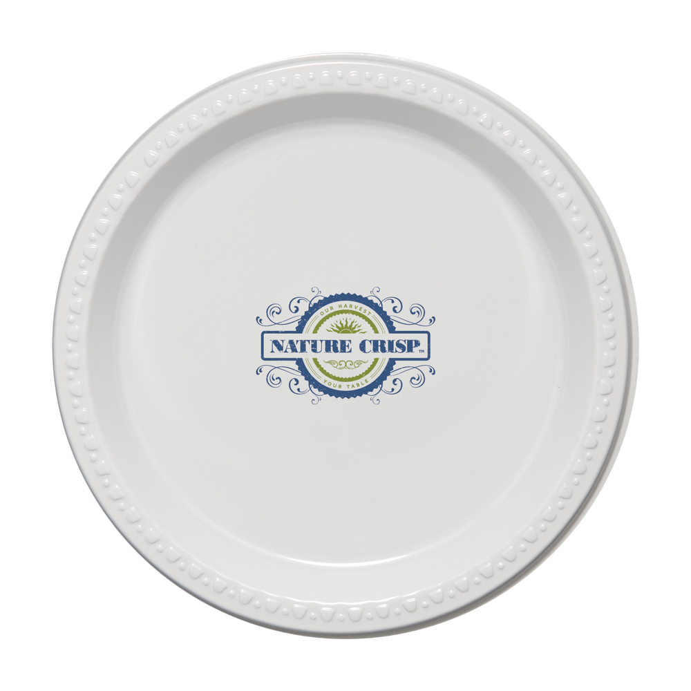 sku: T-PLP9-WHITEThese plates offer a perfect serving size for your logo! These 9" sturdy, white plastic plates are made of recyclable plastic and are great for banquets, company-sponsored events, tailgate parties and picnics. This product is made and printed in the USA.