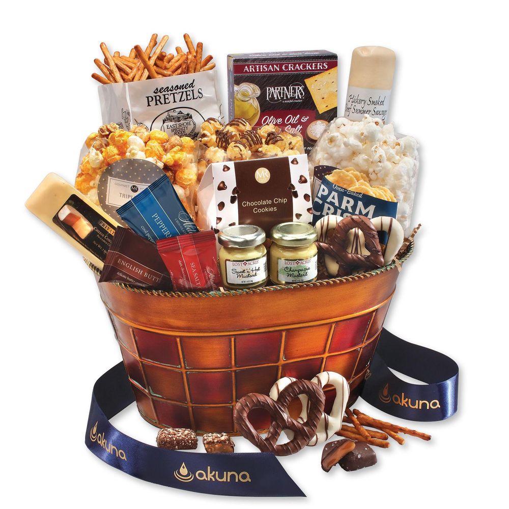 sku: CRH6738Deliciously crunchy treats are offset by private stock Wisconsin cheese, rich chocolates, and more for a gift guaranteed to be a hit! The metallic copper tub comes stuffed with plenty of gourmet delights for them to share—or keep to themselves for when those cravings hit. For the final touch, we tie this amazing gift with ribbon foil-stamped with your logo. Serves 18-25.