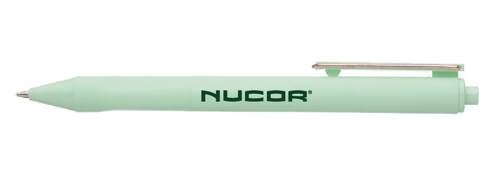 sku: MKT1230Introducing Nucor's Matte Soft Rubber Coated Ballpoint pen. Designed for both style and comfort, featuring a sleek matte finish. These pens offer a smooth 1.00 mm ballpoint tip for flawless writing. Perfect for professional settings or personal giveaways, these pens are functional and stylish choice for any Nucor event. The Nucor word logo is printed in green.